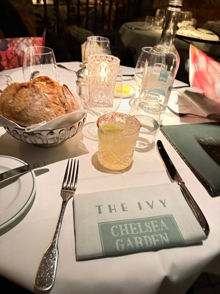 Dining at The Ivy Chelsea Garden is an experience in itself, with its lush interior and garden-like ambiance. I went for the Chicken Milanese with Truffle Sauce, (Crumbed chicken breast with a fried hen’s egg, Parmesan and salad mâche) for 22 pounds. It was light, elegant, and satisfying. It’s the kind of dish that proves simple food can be utterly delicious when done right. I just wish I had taken a photo. I did however get a picture of the AMAZING sourdough bread we had as an app.